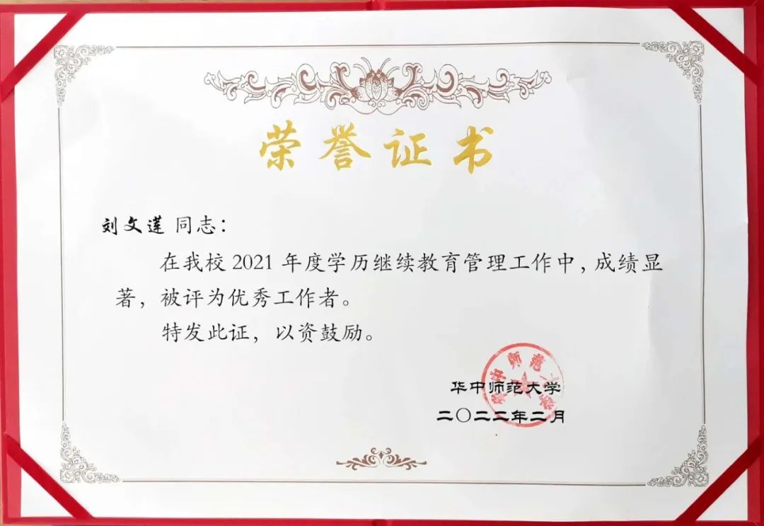刘文莲荣获荣获华中师范大学2021年度学历继续教育“优秀工作者”荣誉称号。