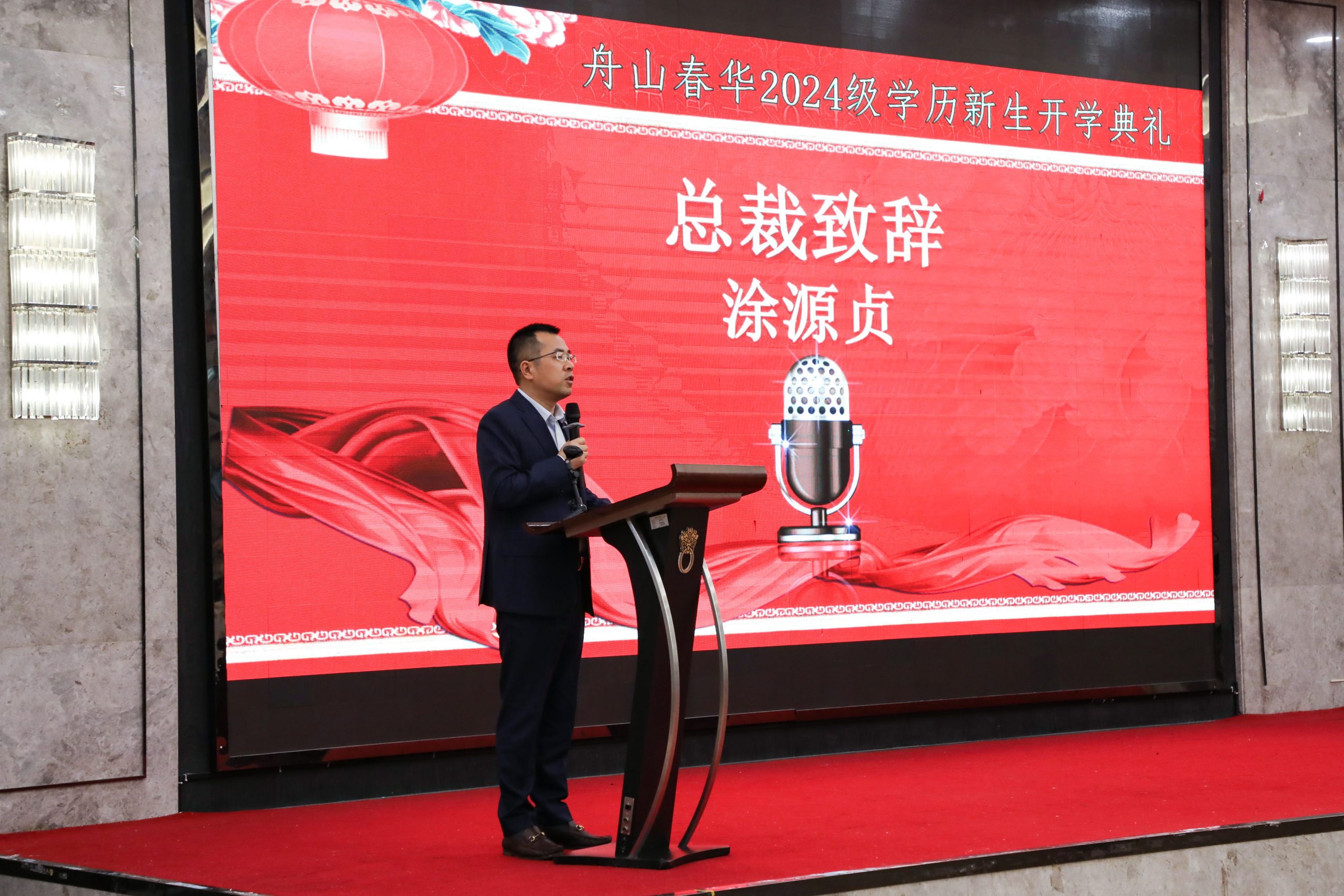 典礼伊始,首先由春华教育集团总裁涂源贞先生致辞,向到会人员表示热烈的欢迎,向全体新生表示诚挚的祝福,并介绍了春华教育集团的发展历程以及近年来的办学形式与办学成果;同时希望全体新生要珍惜学习机会,增强学习信心,努力提升自己,加强个人能力培养,积极拥抱新知识,内化吸收,为己所用。